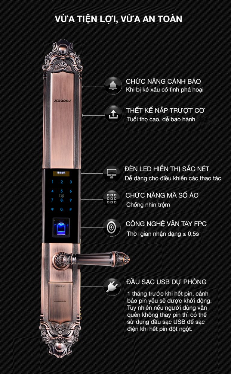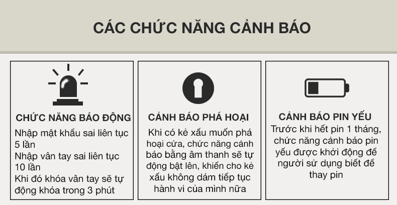 - Cảnh báo khi có lực tác động vào thân khóa và tự động khóa khi nhập sai mật khẩu quá 5 lần.