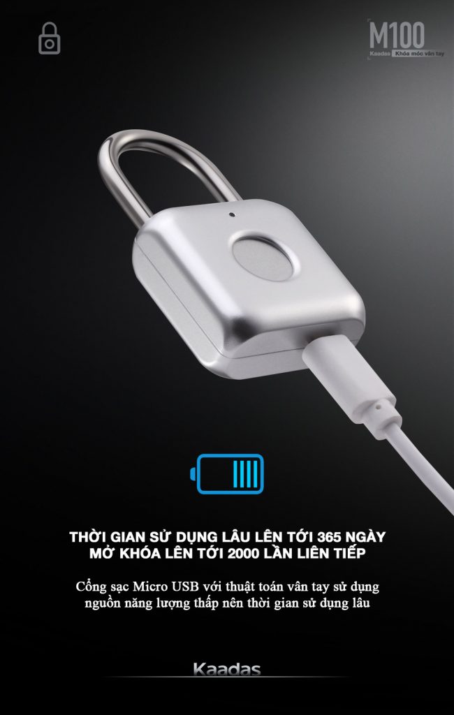 Kaadas M100 được trang bị cổng sạc micro USB rất tiện lợi. Ngoài ra, với nguồn năng lượng thấp, cổng sạc còn giúp M100 có tuổi thọ rất bền.