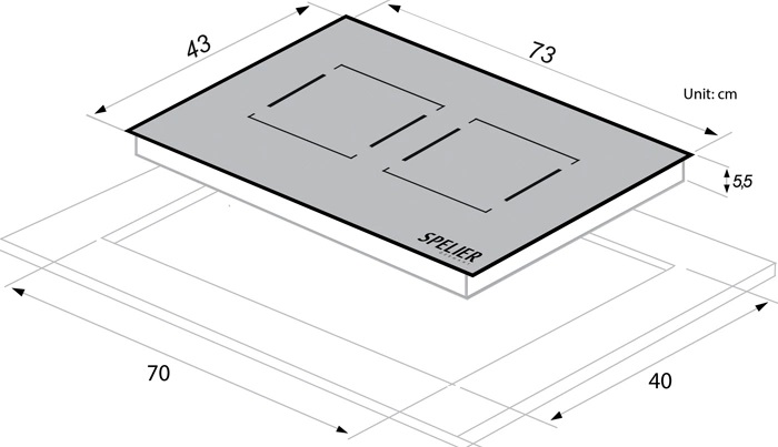 | • Điện áp 220-240V/ 50-60 Hz • Kích thước bếp (D x R x C): 73 x 43 x 5,5 cm • Kích thước khoét đá (D x R): 70 x 40 cm | ![]() |