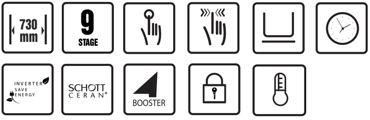 | Các chức năng an toàn | • Chức năng cảm ứng chống tràn • Chức năng cảnh báo nhiệt dư cho từng vùng nấu • Chức năng tự động tắt bếp khi nhấc nồi khỏi vùng nấu • Chức năng khóa trẻ em an toàn |